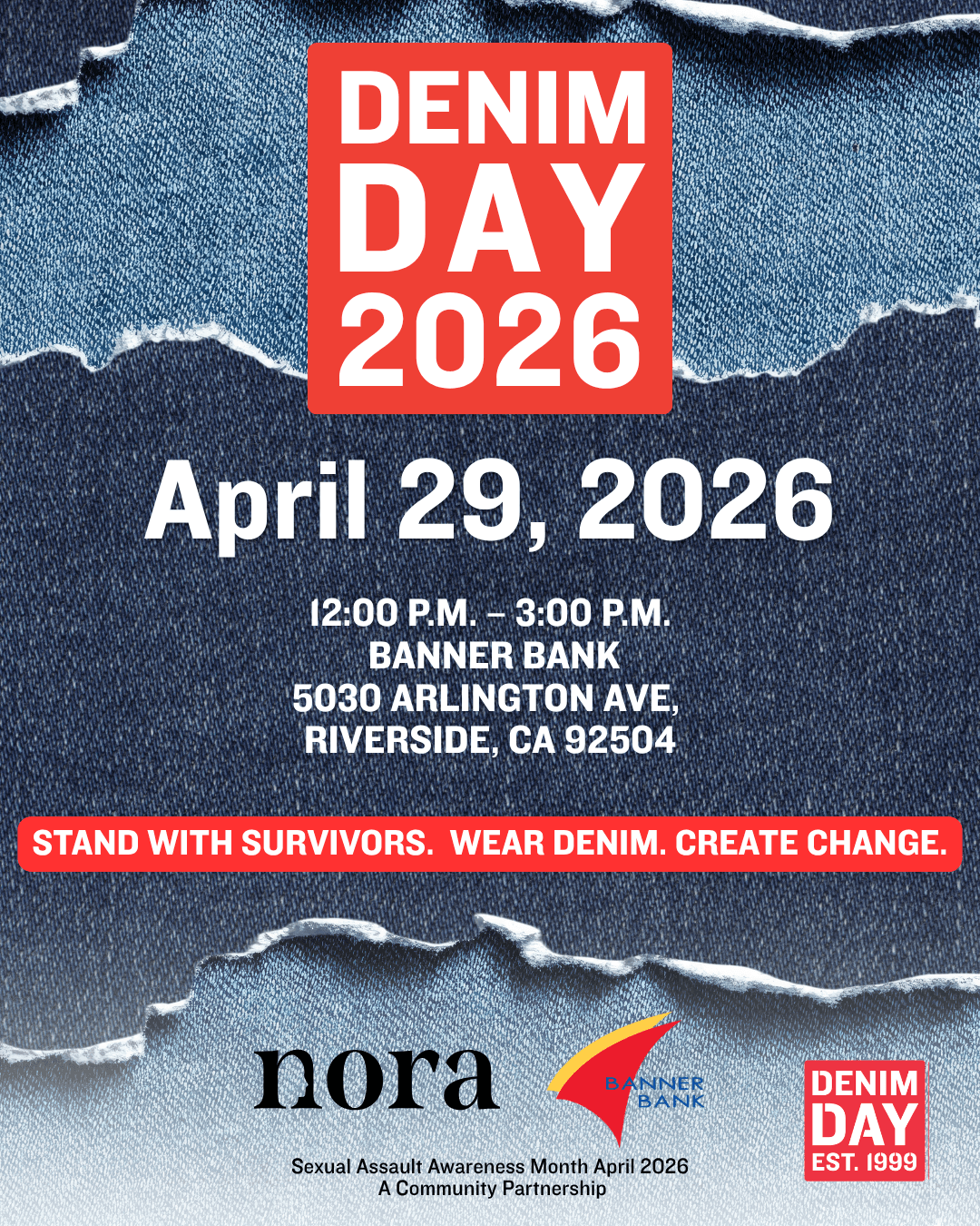 NORA is proud to partner with Banner Bank, our Sexual Assault Awareness Month (SAAM) partner, to host a Denim Day 2026 Community Celebration at Banner Bank in Riverside. Throughout the month of April, Banner Bank has stood alongside NORA in raising awareness, supporting survivors, and amplifying prevention efforts across the community.